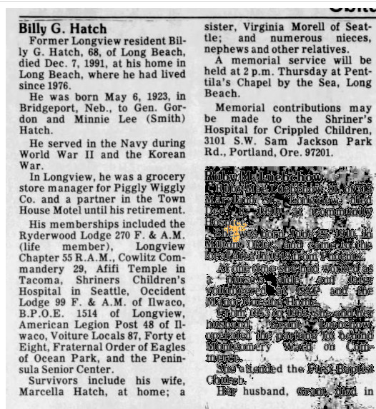 Billy H. Hatch of Longview; two grandchildren and one great-grandchild.