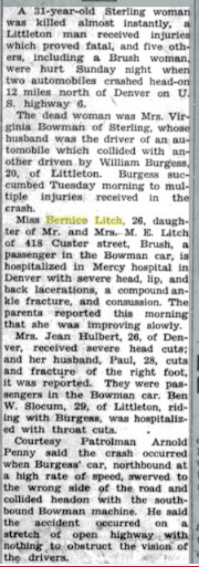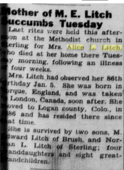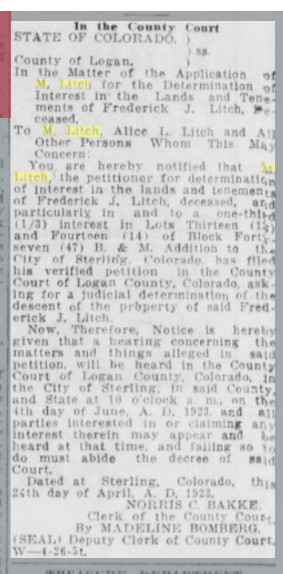 March 1923 "M. Litch was called to Denver today on account of the serious