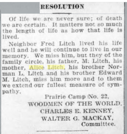 "DIED - on Monday Albert Litch the youngest son of Mr. and Mrs.