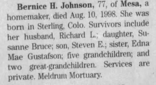 "Norma Lorraine Cresto (dying November 14, 2013) was born on July 28, 1930 in Sterling, Colorado.