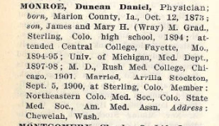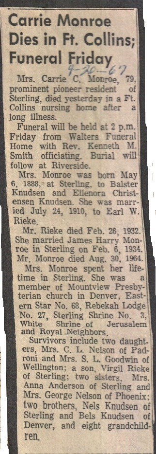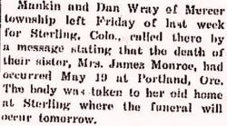 September 1907 Sterling "Walter Ray, who has been visiting the Patterson and Monroe families for the past few weeks, left for his home at Corning, lowa, Wednesday morning."