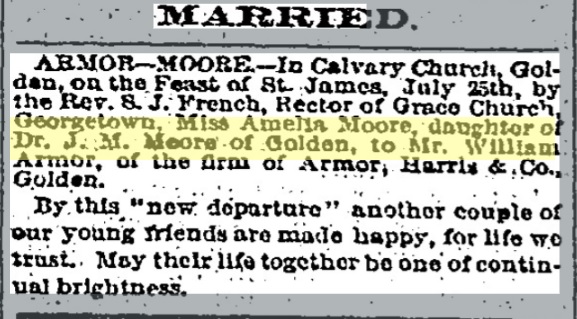 "Mrs. Moore, mother of Sterling Moore, James Moore, Mrs. Armour and the late William Moore, died at Pueblo, October 30,1901. Her remains were shipped to Golden and buried there."