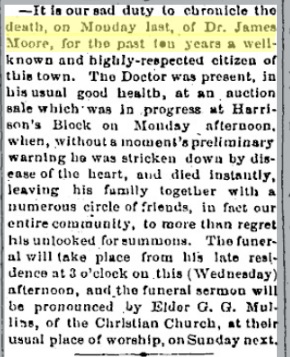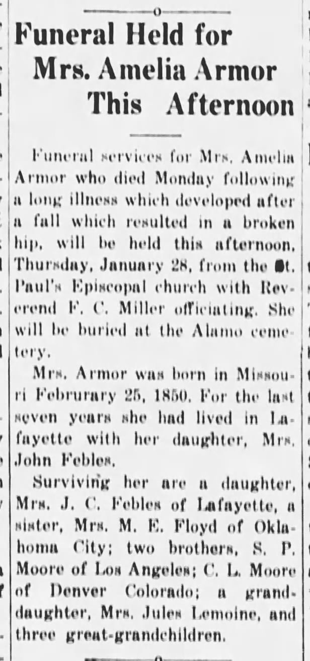 "October 23, 1901 Mr. and Mrs. Wm. Armor, Mrs. Trox Floyd, Charley and Sterling Moore and John Armor were all here to attend the funeral of their beloved relative, Mrs. Moore. They were sadly welcomed by their many old friends and neighbors of former years.