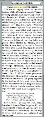Golden, October 23, 1901 "We have the painful news of the death, at Canon City, on Sunday morning last, of Mrs. Sarah E. Moore, relict of the late Dr. J. M. Moore who died here some years since. Deceased came to Golden with her husband and large family in 1864, and this has been her home ever since, and her remains have been deposited in the family ground in the Golden cemetery beside her husband. The funeral occurred yesterday afternoon from the Christian church attended by a large concourse of relatives and friends. The bearers were Messrs. G. W. Dollison, Dr. James Kelly, J. H. Titus, J. R. Ward, W. H. Carter and Geo. West, all old citizens who have known deceased and her family during all the years of their residence here."