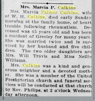 January 1907 Greeley "Mrs. Mary Palmer died last Thursday, Deo. 27, 1906,