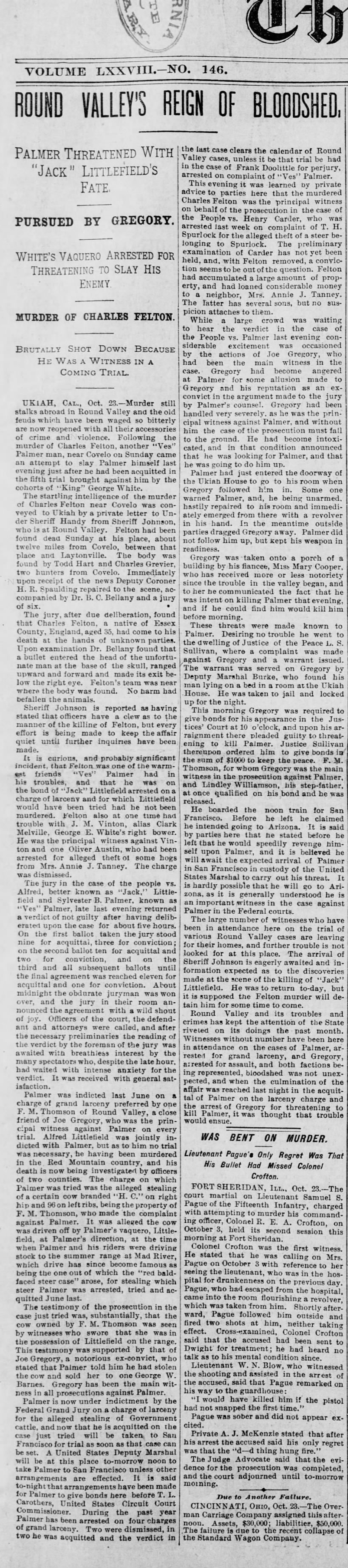 November 1898 Ukiah, California "Ves Palmer was down from Round Valley the Middle of