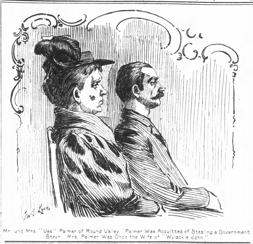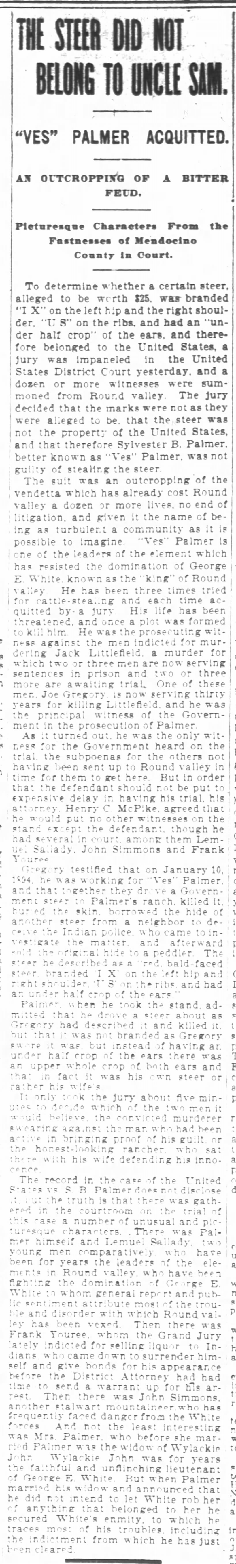 Round Valley, California "Clarence White was tried at Ukiah for killing Wylackie John and promptly acquitted. Such satisfaction was shown over the verdict that even the Judge got drunk and so noisy that the Sheriff attempted to arrest him.