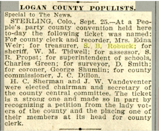 In September 1891 S.B. Robuck was the Logan County delegate to the People's Party convention in Denver.