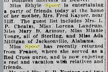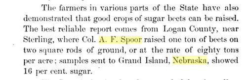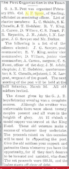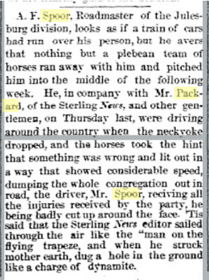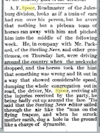April 1888 Fort Morgan "A. F. Spoor, of Sterling, spent several days in town last week. Mr. Spoor is a