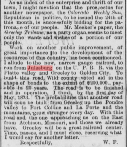 In January 1874 Myra wrote: Julesburg, Colorado