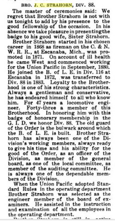 In 1885, J.C. Strahorn is 36, a foreman at the round house, born in Pennsyhlvania of Pennsylvania parents, Sarah 36 of New Hampshire, Arthur 8 on Michigan, and J. P Wood, 45, sister, single,
