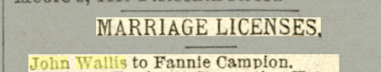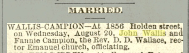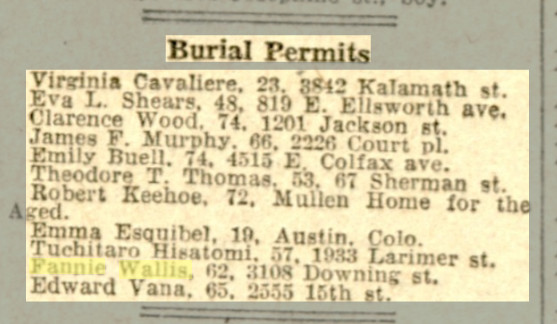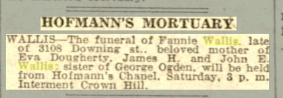 October 27, 1925 "John Edward Wallis Sr., late of 3108 Downing, beloved husband of Mrs. Fannie Wallis, father of James H. Wallis, John Edward Wallis Jr. and Mrs. Jesse E. Dougherty. Notices of funeral later."