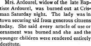 January 6, 1896 Boulder "We desire herein to extend heartfelt thanks to all those who have helped or been instrumental in assisting us in our late misfortune. Mrs. B. Ardourel and family."