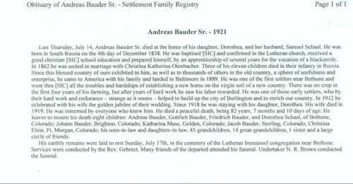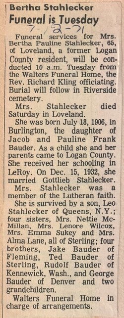 Bauder and Jake Bauder; and four sisters: Bertha Stahlecker, Emma