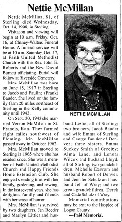 (Frank) Bauder. She grew up on a farm southeast of Sterling. She