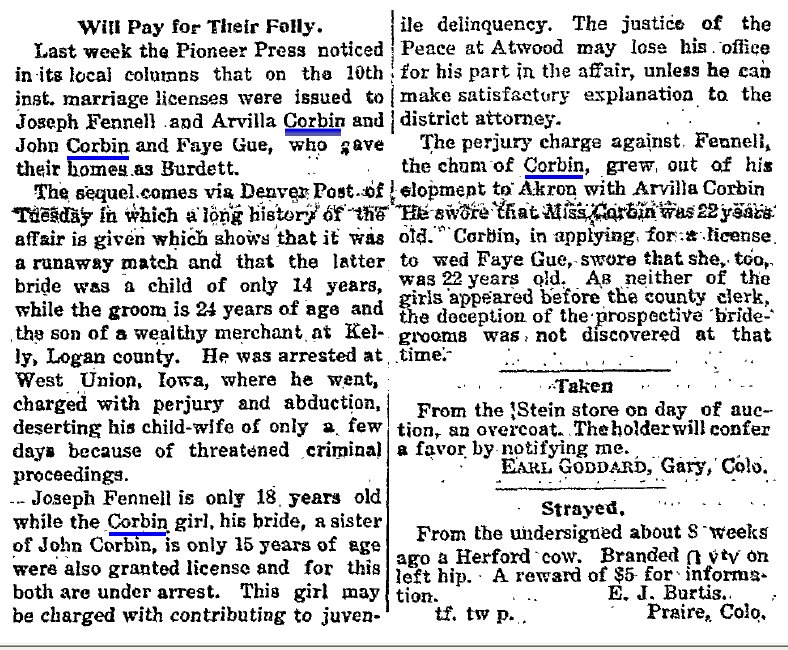 March 1915 "Bernard N. Lair, 22, and Verdie Corbin, 18, both of Burdette,