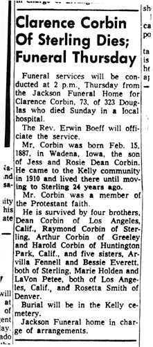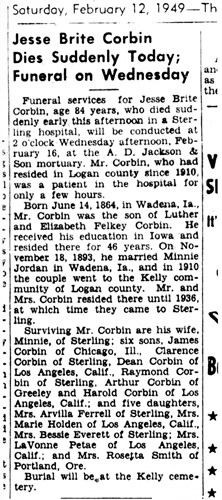 He died on 12 Feb 1949 in Sterling Colorado. Jesse Corbin went