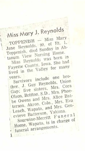 Mary Jane Reynolds d: 11 Jun 1967 in in a nursing home, Yakima,