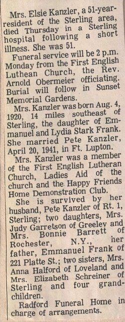 Emanuel 1880-1976 and Lydia (Stark) Frank 1890-1971 are buried in Sunset Memorial, Logan County.# 41785785