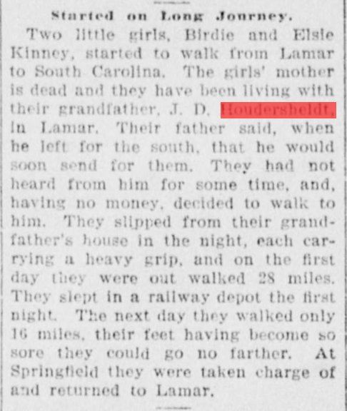 May 1918 Marshalltown, Iowa "Mr. and Mrs. J.D. Houdersheldt, of the soldiers' home, left this morning for Lamar, Missouri to visit relatives and friends."