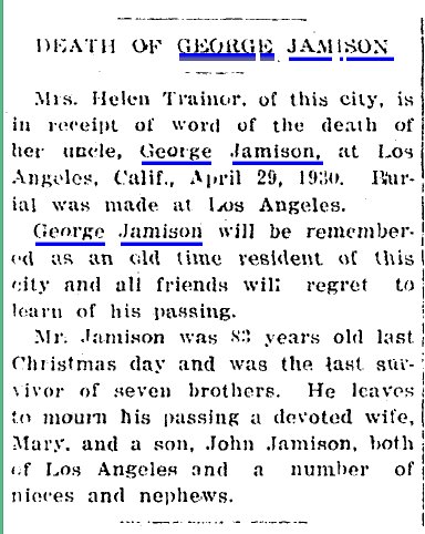Maybe the gold miner George Jamison in 1885 Pitkin County, Colorado, with Mary 26, John 7, and Lottie 5. In 1900 Teller County, born Jan 1848 married 24 years to Mary Jan 1859, both in Pennsylvania. They have John Aug 1848 Pennsylvania and Pauline Aug 1888 Colorado.
