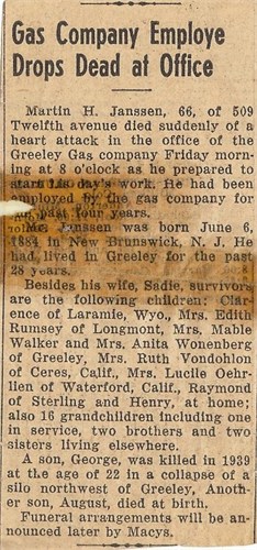 1938 Greeley Colorado JANNSEN George John Janssen of 426 12th St. Son of Mr. and Mrs. Martin Janssen of Greeley. Brother, Clarence Janssen of LaSalle,. Mrs. Edith Rumsey of Briggsdale, Miss Ruth Janssen of Modesto, Calif., Mrs. Mabel Adolph, Raymond, Lucille,. Anita, and Henry Janssen all of Greeley. Arrangements later.