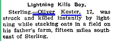 FindaGrave 28187138 says Marion Oliver Kester 1898-1915 buried in Sterling was just 18 years and 7 months of age at this death caused by being hit by lightning. His sister Lucinda (Lucy) Kester Jones named one of her daughter's after him, that being Marion Ollie.