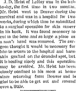 In 1900 Leroy precinct, Logan County, Colorado, Jacob D. Heist born July 1866 in Canada, married eight years to Carrie Nov 1872 Germany. They have Earl L. July 1893, Lillie M. July 1895, and Rose C. May 1898, all three born in Colorado.
