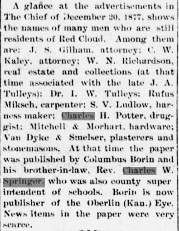 CHARLES W. SPRINGER, Webster County, Nebraska, Superintendent, was born in Lamoine, Hancock County, Maine. After receiving a preparatory course of studies, he entered the Eastern State Normal School, and graduated in 1871. He then came to Dawson County in 1873, and in January, 1874, he came to Red Cloud and engaged in teaching. In April, 1880, he was licensed to preach by the Baptist denomination. In the fall of 1881, he was elected County Superintendent. Ordained a Baptist Minister April 30, 1882.