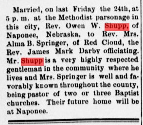 Owen W. Shupp born about 1858 in Pennsylvania, married Alma B. Springer, born about 1856 in Illinois, on December 24, 1897 in Red Cloud, Nebraska.