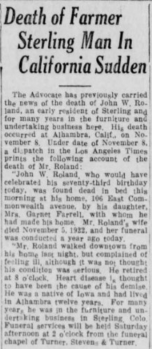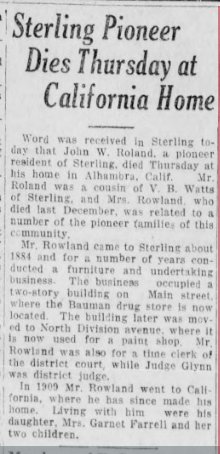 November 1922 "Mrs. John Roland, a pioneer citizen of Sterling, died Sunday at her home in Alhambra. Calif.,