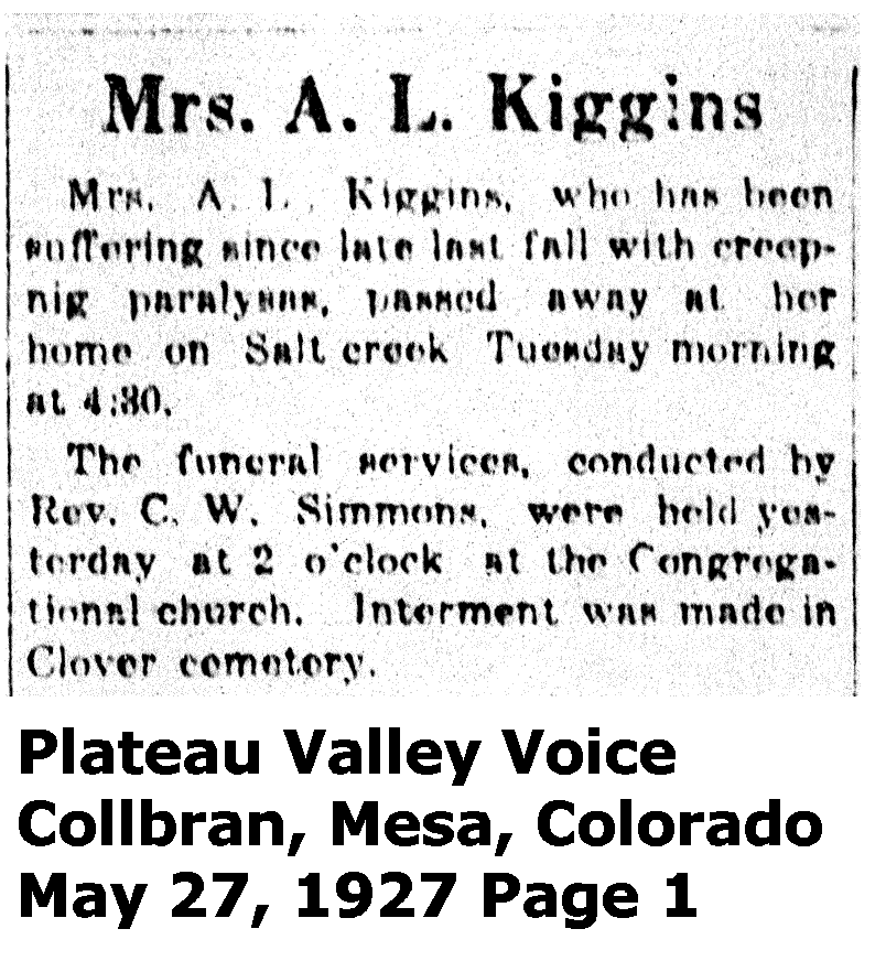 | Kiggins, Mrs. A. L. Died 1927 Obituary | ||