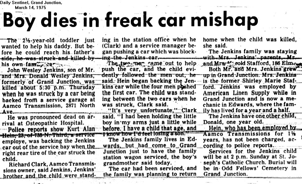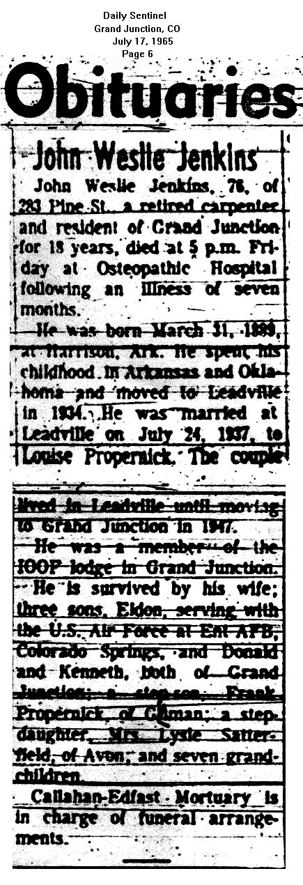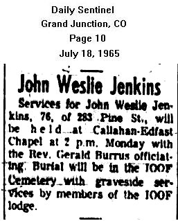 | Jenkins, John 1889-1965 [Shirley at KillCoyote@aol.com] Obituaryuary Funeral notice | Stafford Harold 1905-1983 [Shirley at KillCoyote@aol.com] |