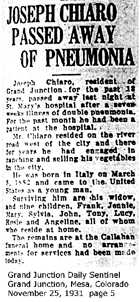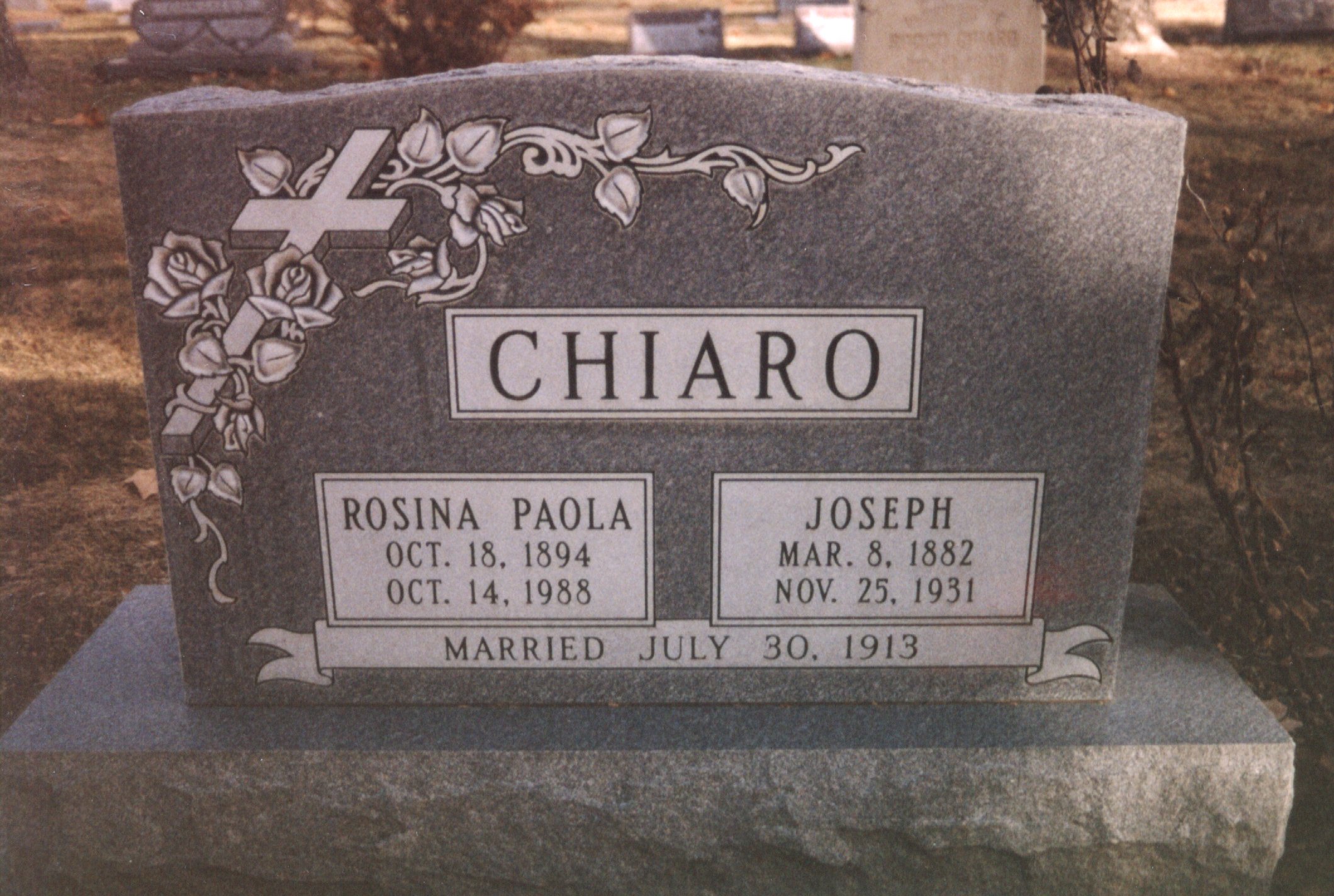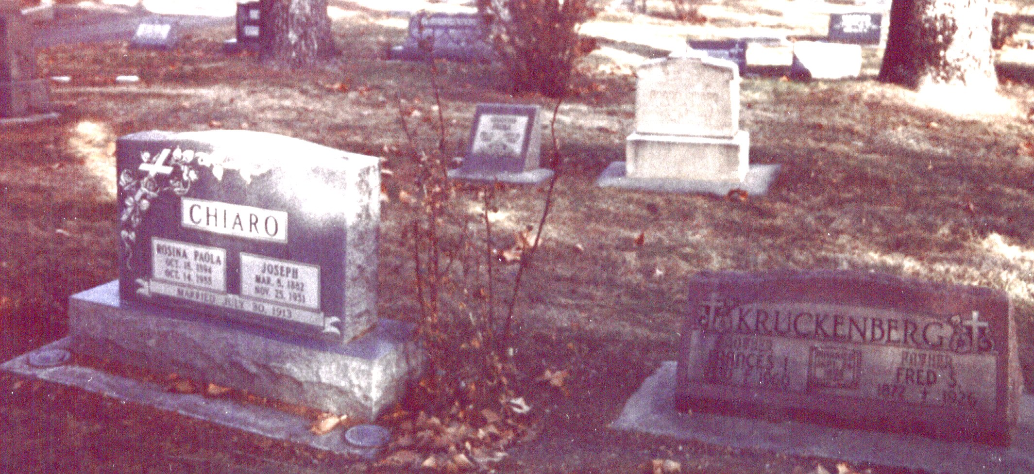 | Chiaro, Joseph 1882-1931Obituary GS 8 Lot 1 Block 84 Chiaro, Rosina 1894-1988 Obituary GS 7 Lot 1 Block 84 [Mary at SmilinHeavy@aol.com] | Stolz, Matthew 1867-1908 |