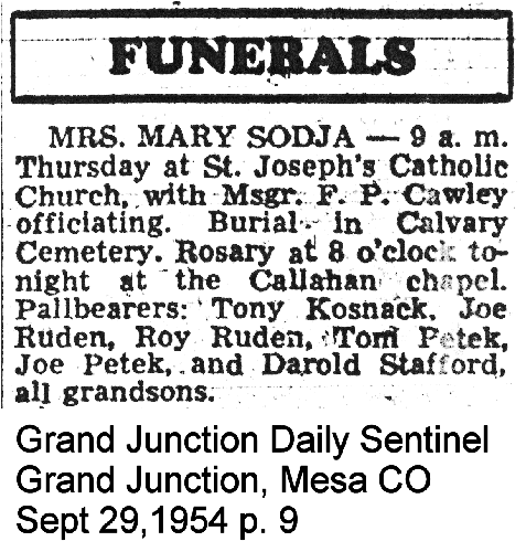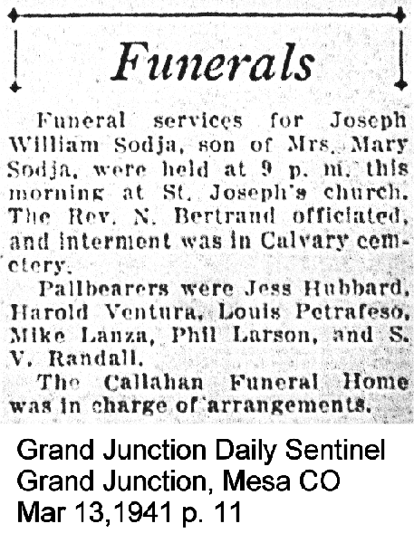 Sodja, Joe, son of Mary, 1902-1941 Obituary1 Obituary2 [Grave Section 8 ] [Shirley at KillCoyote@aol.com] |