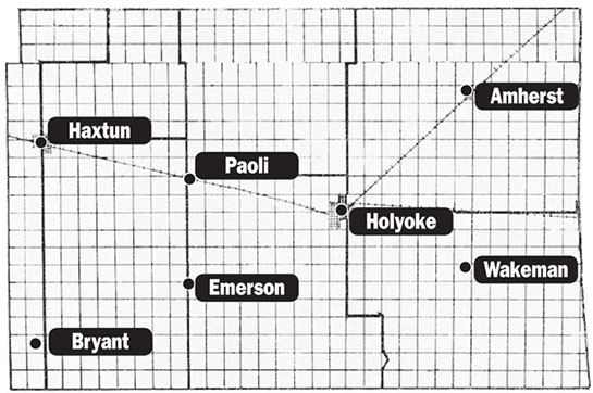 Located 7 1/2 miles west and 4 south of Holyoke, Emerson found itself in the same situation as Bryant along the never-completed Holyoke-Akron rail. Emerson, along with the settlement of Wakeman—7 miles east and 3 miles south of Holyoke—eventually disappeared as well.