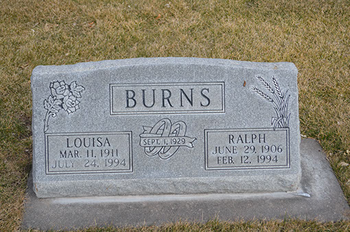 Louisa Burns of Julesburg was born March 11, 1911 to Ernest Veach Colvin and Aggie Frances Mains Colvin on a farm near Gibson City, Illinois. She died July 24, 1994 at the Sierra Fiesta Health Care Center in Loveland at the age of 83.