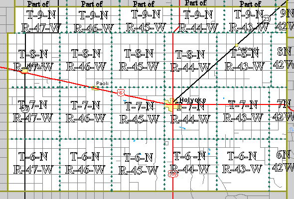 Land survey townships are six miles square and are sub-divided into thirty-six sections. Township numbers are referenced to the survey grid "Baseline" at 40° North running east to west through Yuma County. Range numbers are referenced to the 6th Principal Meridian which runs north to south in Eastern Nebraska.
