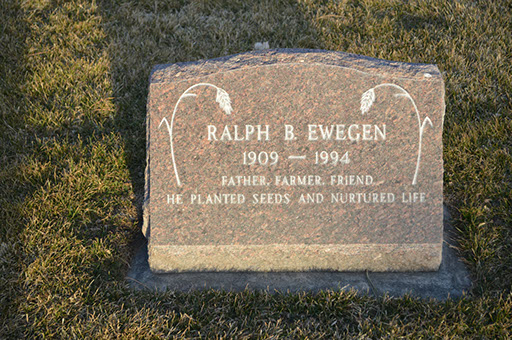 Ralph B. Ewegen of Amherst was born April 5, 1909 in Crete, Nebraska. He died Tuesday, June 21, 1994 on his farm immediately north of Amherst when a farm mower he was servicing fell on him after a jack gave way. He was 85.