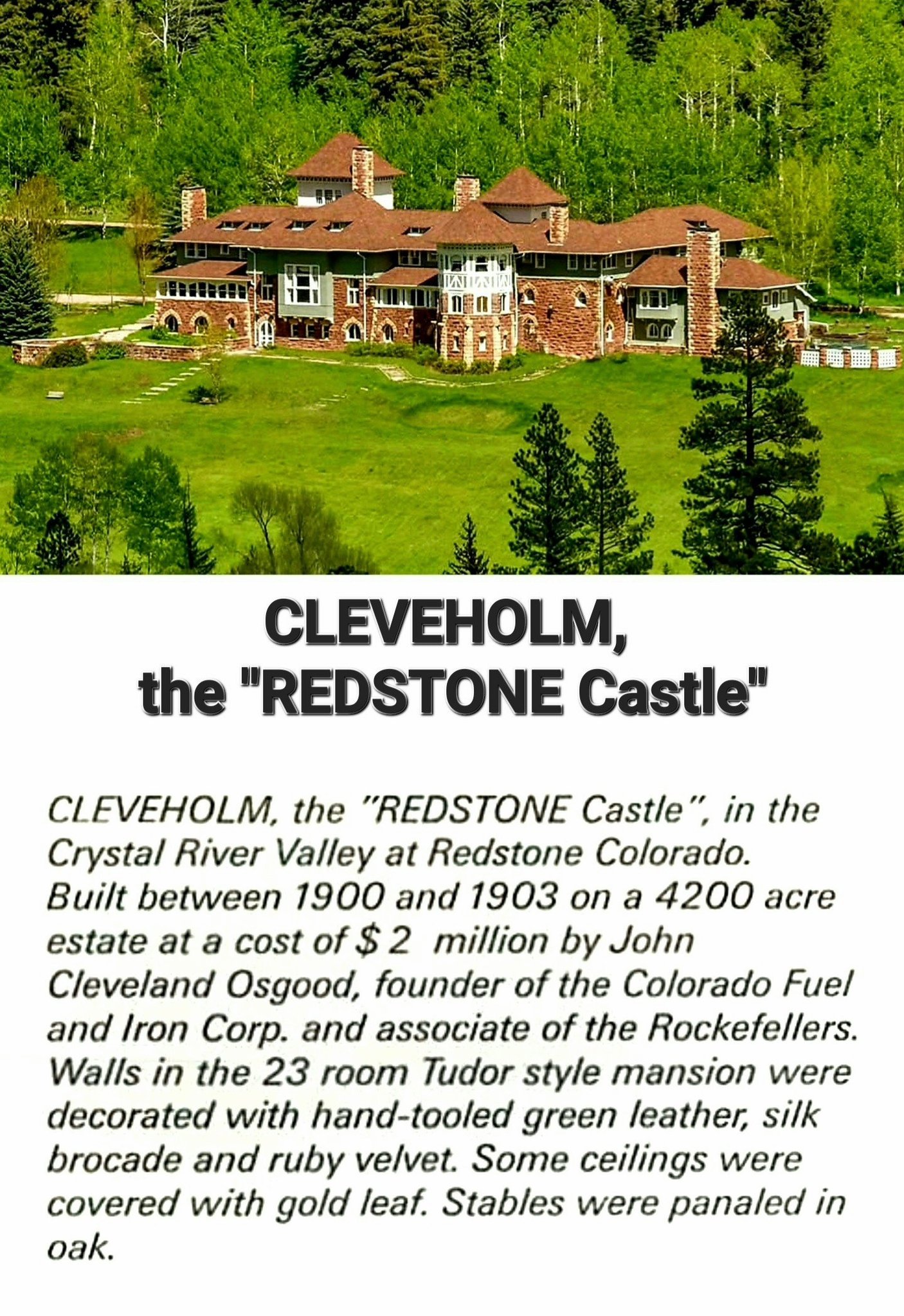 Osgood's Estate: Osgood built the opulent, 42-room Tudor-style mansion, Cleveholm Manor (now known as Redstone Castle), overlooking the town and river.