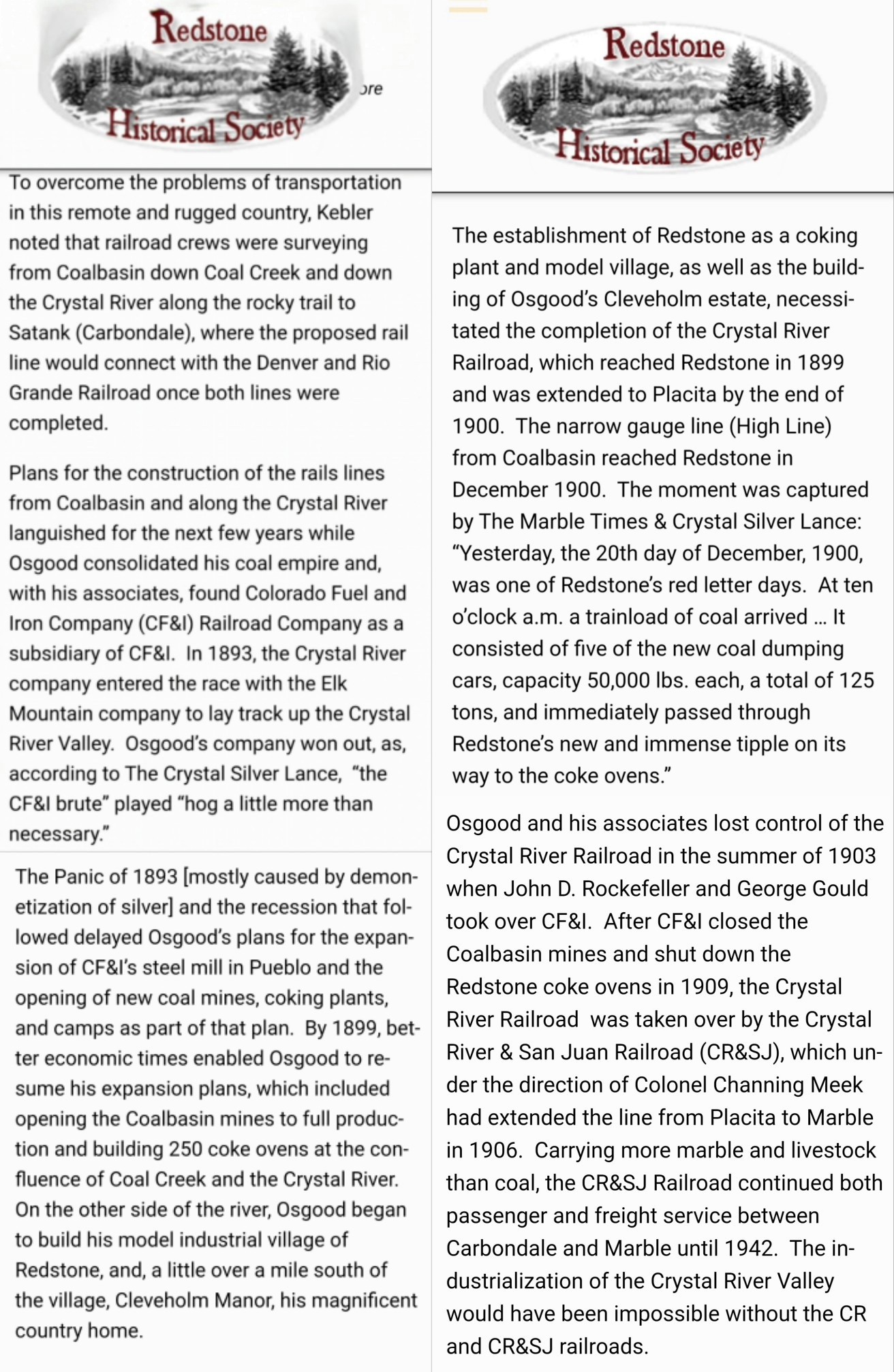 The Coal and Coke Industry: The town's purpose was to support the nearby Redstone Coke Ovens, which processed high-grade coking coal from the Coal Basin mines to produce coke for Osgood's steel mill in Pueblo.