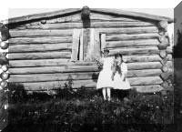![]() Two girls wearing dresses stand outside of a log cabin school with a boarded up window in the mining community of Hahn's Peak (also known as Poverty Bar), Colorado in Routt County. Each child holds a bouquet of flowers. |