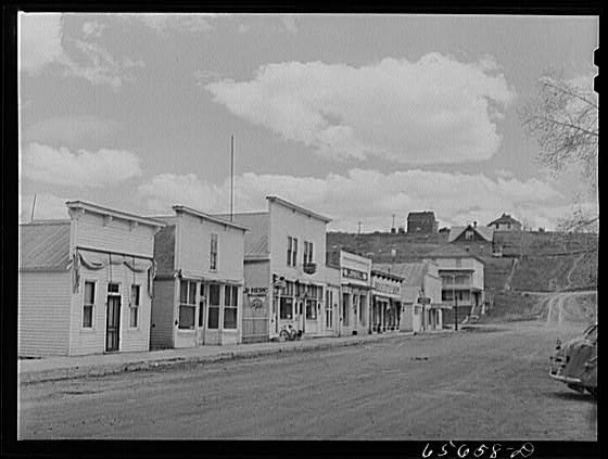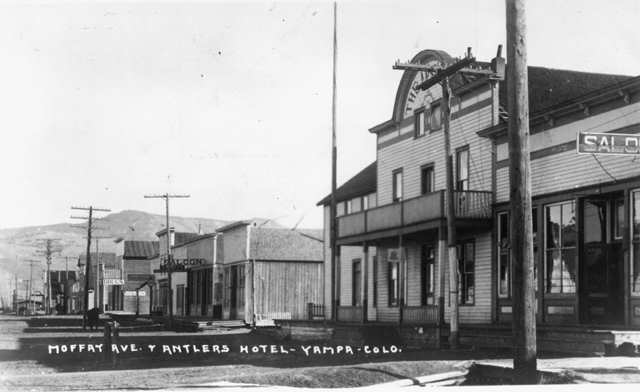 ![]() View of Moffat Avenue, Yampa (Egeria) Routt County, Colorado; signs read: "The Antlers," "Saloons," "Drugs," "Yampa Restaurant," "Famous Restaurant & Bakery," and the "Moffat Avenue Restaurant." |