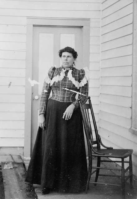 ![]() Auntie Lindsey poses in Yampa, Routt County, Colorado. She wears a long skirt, a corseted bodice with ruffles, and a wedding ring. |