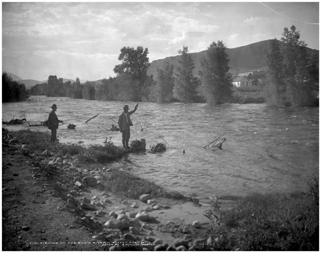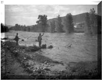 ![]() Two men fishing in Yampa (formerly Bear) River, Colorado reached via Moffat Road, Denver & Salt Lake Railroad (formerly Denver, Northwestern & Pacific); wooden frame residences and buildings viewed across river behind trees. |