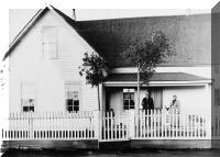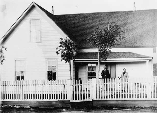 ![]() William Bird and his wife stand on their porch in Yampa (formerly Egeria,) Routt County, Colorado. The two-story frame house has intersecting gables, a picket fence and trees. |