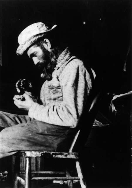 ![]() Miner Ed Burnett sits in a chair and examines a piece of ore with a hand-held magnifying glass in the interior of a cabin in the town of Hahn's Peak (also known as Poverty Bar), Colorado in Routt County. He wears a long-sleeved shirt, dirty trousers, and a canvas hat. |