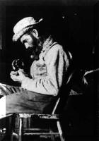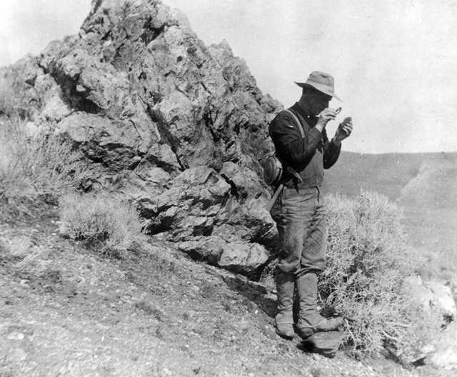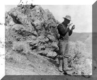 ![]() Sam Stevens, a resident of the mining community of Hahn's Peak (also known as Poverty Bar), Colorado, in Routt County stands on a hillside in the Humbolt Mountains of Nevada and examines a piece of ore with a magnifying glass. He wears trousers, a long-sleeved shirt, suspenders, a cowboy hat and a canteen over his shoulder. |