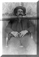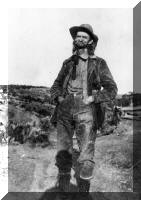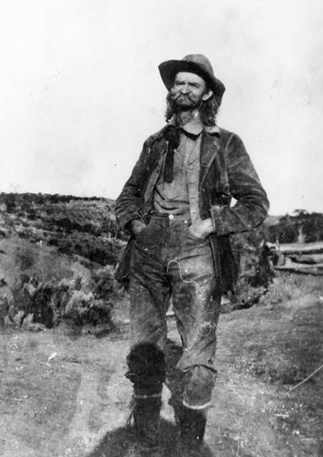 ![]() J. C. Mobley, prospector, a noted character of Western CO, stands with his hands in his pocket on a slope near the town of Hahn's Peak (also known as Poverty Bar), Colorado, in Routt County. He wears a suit jacket, denim jeans, calf-length leather boots, a front-button shirt, a string tie, and a hat. He has shoulder- length hair and an unkempt mustache. "Mobly was very friendly with the Ute Indians on their hunting expeditions." |