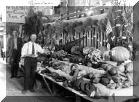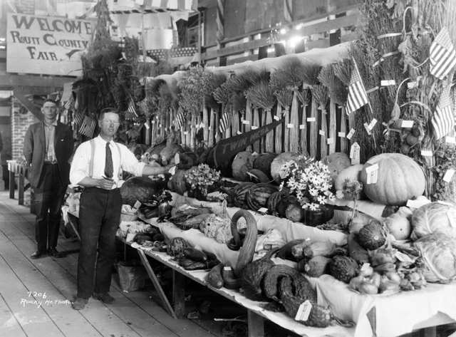 ![]() A man poses with pen in hand as he annotates an exhibit tag at an agricultural exhibit of the Routt County Fair in Hayden, Colorado. Another man watches behind him. Items on display include grains, fruits, squash, and other vegetbles. American flags decorate the exhibit. Signs: "Welcome Routt County Fair." |